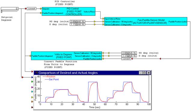 A new local variable called paddle_pos_degrees is created and wired to an additional output tab to bring this value out and provide external access to it for monitoring purposes. The complete system representation is as follows: