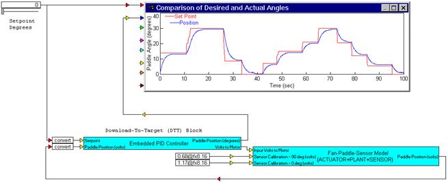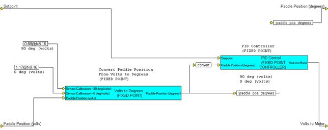 In the fixed-point version of the fan-paddle position control system, the PID Controller (FIXED POINT CONTROLLER) and Volts to Degrees (FIXED POINT) are the control and logic functions for this system. To ready this system for direct implementation on an embedded target, it follows that all you need to do is collapse these two compound blocks into a single compound block.