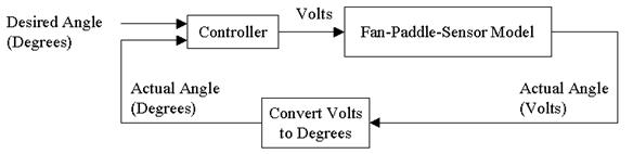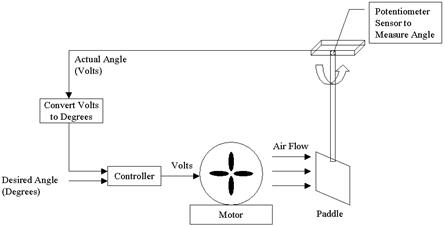 The system comprises an electrical motor connected to a small propeller that blows air on a paddle. The paddle is moved at an angle from the vertical. The control problem is to adjust the speed of the motor by varying its input voltage to maintain the paddle at a user-defined angle from the vertical. The system can be schematically represented as shown below.