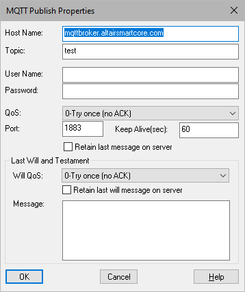 Host Name: Specifies the MQTT broker address. For SmartWorks, use mqttbroker.altairsmartcore.com for data exchange and mqtt.altairsmartcore.com for API.