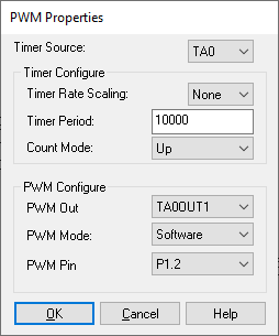 Timer Source: Specifies the timer source. If you choose the same timer for each PWM, then you must also choose the same timer rate and timer period for each PWM. Check with your MSP430 part description for the number of PWM outputs that are available.