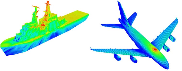 Figure 2. MLFMM analysis of a ship (on the left) and antenna placement modelling on a commercial aircraft (on the right).