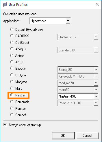 2. In the User Profiles window, choose the Nastran or OptiStruct format and validate the box: