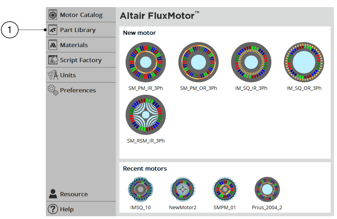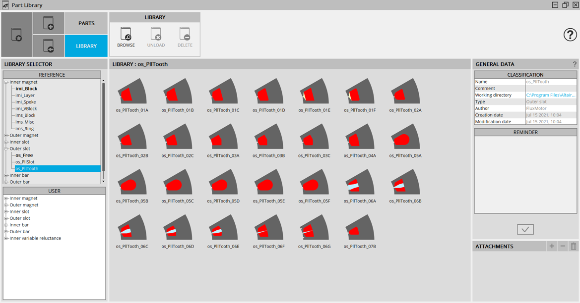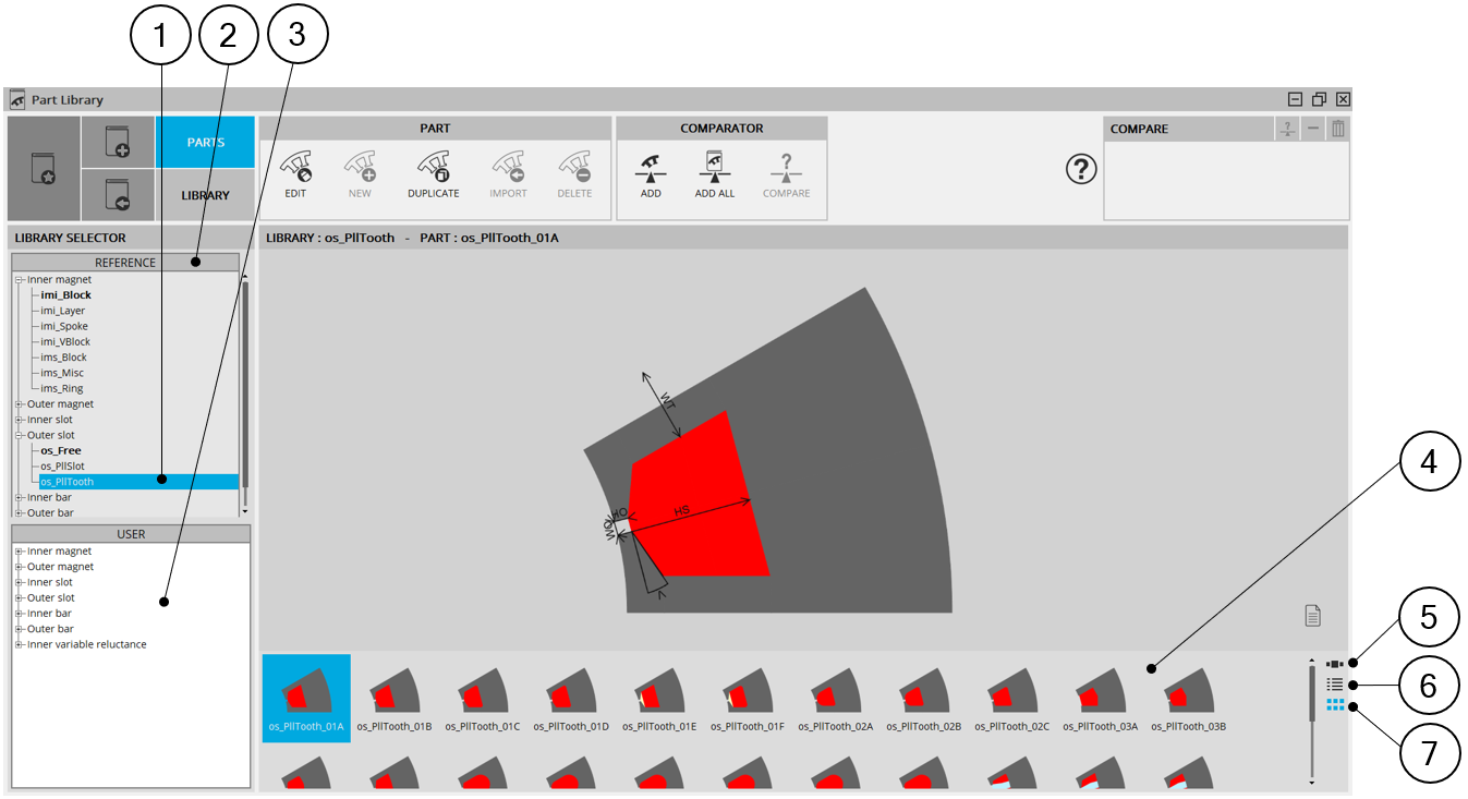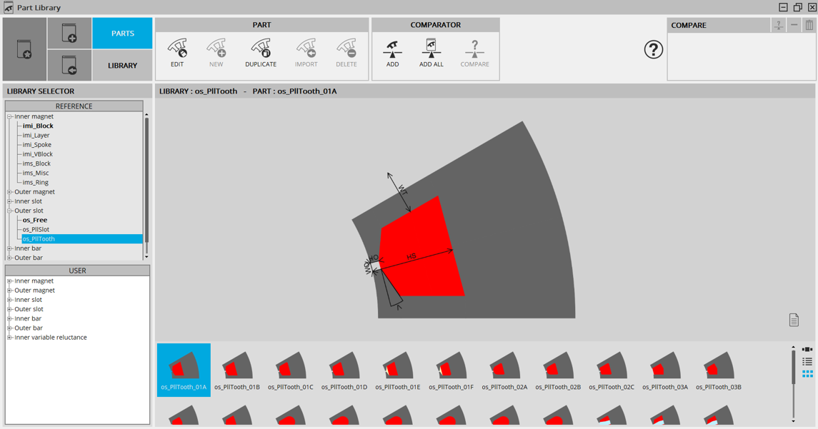 - From Motor Factory, in the Slot area, Bar area or the Magnet area of the DESIGN environment it is possible to get into Part Library using a Read Only mode to visualize, compare, choose and import part topology to modify the current stator design or the rotor design