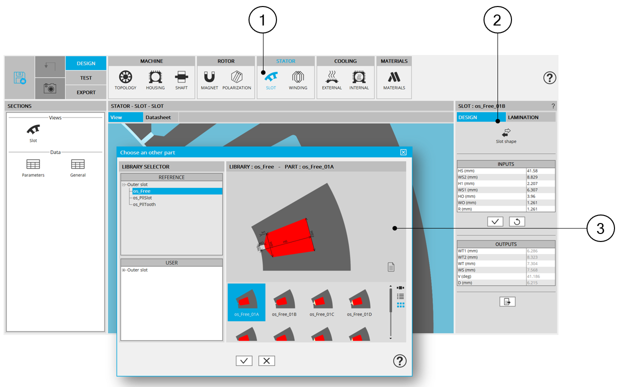 | 3 | Clicking on the "Slot shape" button opens a dialog box, allowing access the slot libraries.It allows to visualize, compare, choose and import another slot topology to modify the current stator design. |