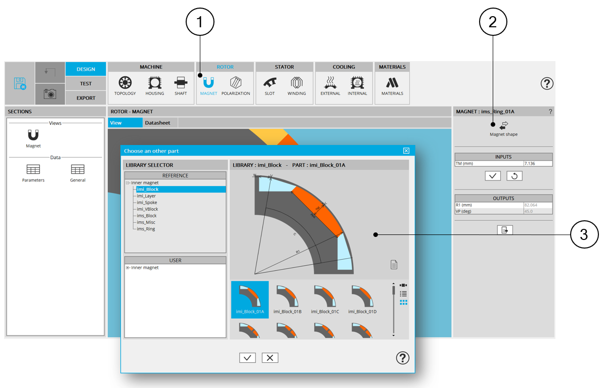 | 3 | Clicking on the "Magnet shape" button opens a dialog box, allowing access to the magnet libraries. It allows to visualize, compare, choose and import another magnet topology to modify the current rotor design. |