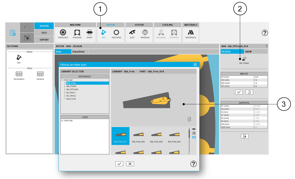 | 3 | Clicking on the "Bar shape" button opens a dialog box, allowing access the libraries.It allows to visualize, compare, choose and import another bar topology to modify the current rotor design. |