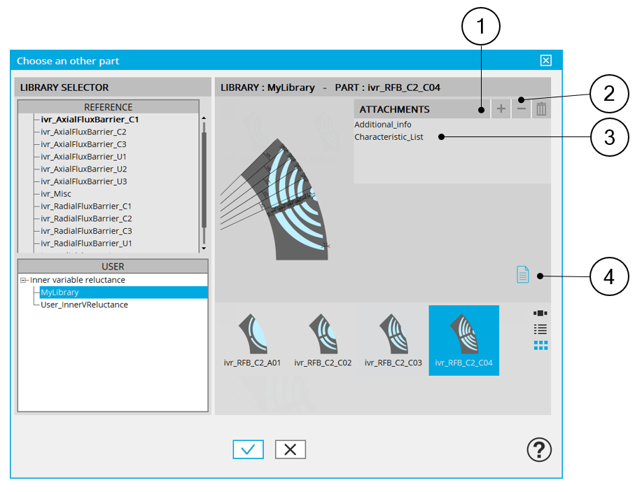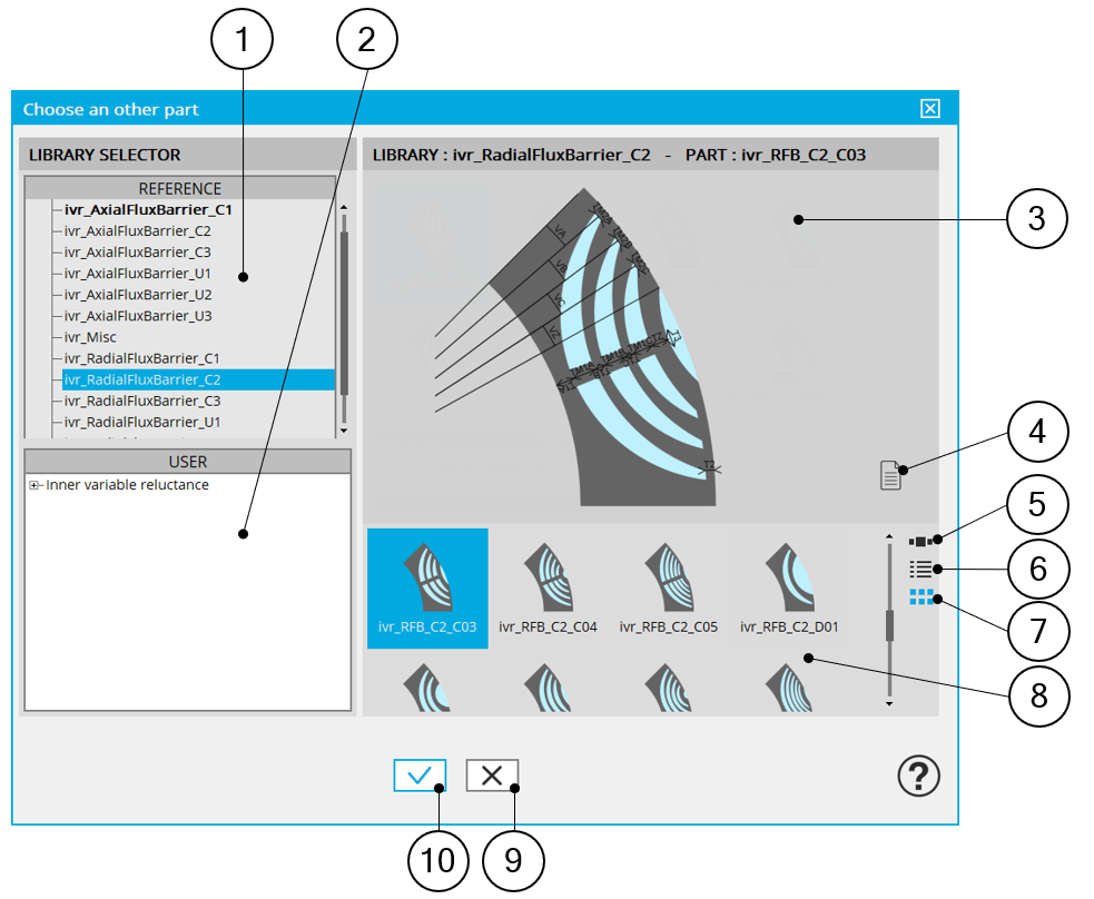 | 2 | Visualization of user libraries. The default user library is “User_InnerVReluctance”.See “Part Library” application for more information. |