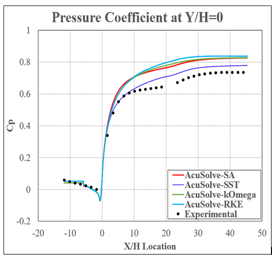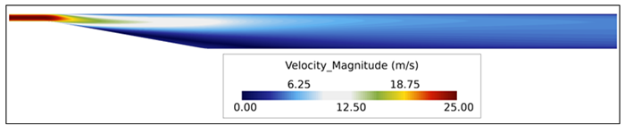 In this application, a fully developed turbulent flow at a Reynolds number of 20,000 is studied. Due to the adverse pressure gradient, separation of flow occurs and causes recirculation in the divergent section of the diffuser. The results were found to be consistent with previously published computational studies and experimental data. The results of this validation demonstrate the ability of AcuSolve to accurately predict the separation point, the recirculation that occurs along the divergent wall, and the reattachment point in the straight section of the diffuser.