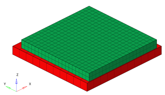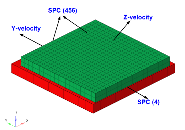 Both blocks are meshed with first-order CHEXA elements and frictional contact is defined between the blocks with a friction coefficient of 0.05. The bottom block is constrained in all directions. One side of the top block is constrained along the Y direction, while the opposite side is subjected to an enforced velocity and constrained along the X, Y, and Z rotational degrees of freedom. The upper side of the top block is subjected to an enforced velocity and is constrained along the X, Y, and Z rotational degrees of freedom.