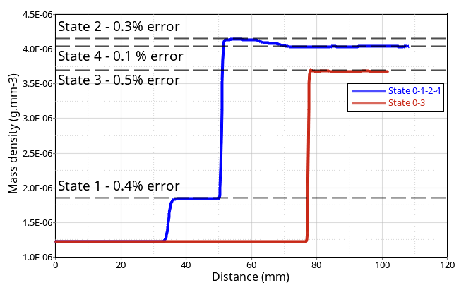 from the model can then be compared to those determined analytically. Figure 10. Pressure Profile in Steady-State. with the value of the relative error to the analytical value Figure 11. Mass Density Spatial Profile in Steady-State. with the value of the relative error to the analytical value
