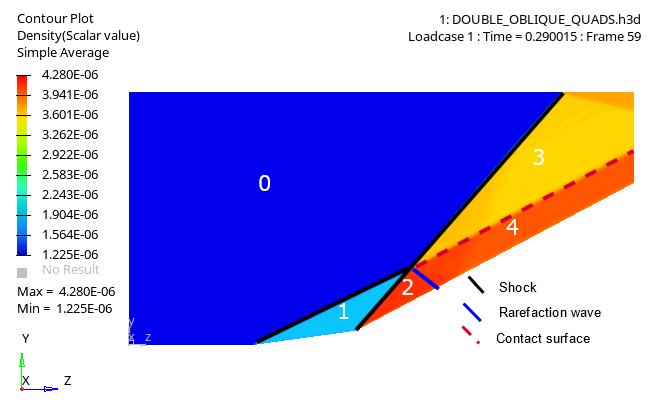 the flows encounters two wedges, three stationary shock waves and a contact wave are