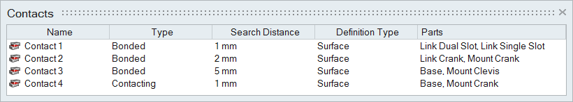 “接触”表格列出了模型中的所有接触,其中包括连接的类型及其所连接的零件。