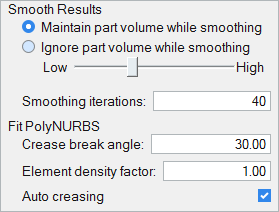 - 平滑化时维持零件体积是默认选项。忽略零件体积会提供更加平滑的结果,但材料会显示得更薄或在某些区域被完全删除。