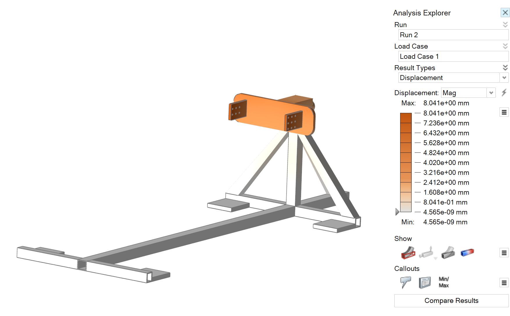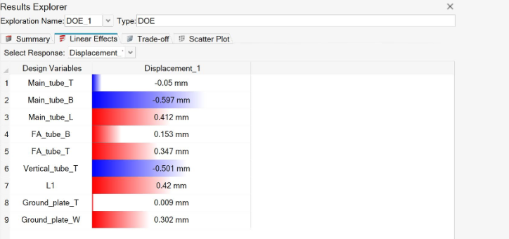 浏览 DOE 运行结果 在“设计管理器”功能区,选择结果浏览器工具。 这会打开结果浏览器。有 4 个结果选项卡:汇总、线性作用、平衡,和散布图。 选择汇总表 选项卡。 汇总表显示了逐个运行的探索总结。各列显示每次运行的输入设计变量值和相应的响应值。更多信息请见汇总表。 选择线性作用 选项卡。 线性图显示了设计变量对选定响应的模型的相对影响。数字越大,相对于其他变量,给定变量的影响就越大。效果的颜色表示给定效果是正面的还是负面的。正面效果以蓝色阴影显示,表示设计变量的正面变化会导致响应的正面变化。 负面效果以棕色阴影显示,表示设计变量的正面变化会导致响应的负面变化。FA_Tube_B 的线性作用为 -2.021,意味着管道底座宽度的增加将减少位移响应。从最小设计变量 96 mm 到最大设计变量 144 mm 的全部线性作用约为 -2 mm。 更多信息请见线性作用。 选择平衡 选项卡。 “平衡”让您能够预测不同设计变量产生的响应值,不论这些值是否使用线性作用运行。在这种情况下,您可以在范围内设置任何变量,并得到计算出的响应值。更多信息请见平衡。 选择散布图 选项卡。 散布图是一种 2 维图表,显示变量的趋势或它们之间的关系。更多信息请见散布图。 关于如何保存和导出优化后的形状,请查看导出几何和结果。