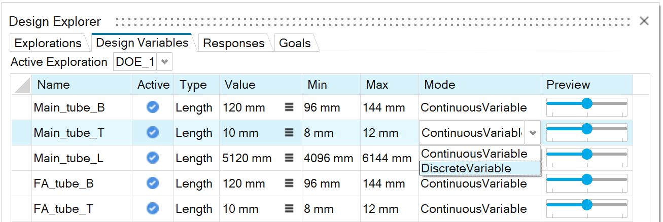 创建 DOE 并激活变量 在“设计管理器”功能区,选择探索工具。 所有未链接到其他变量的几何变量均被自动转换为设计变量。 在“探索”选项卡上,点击 + 添加探索,然后选择 DOE。 此时创建一个激活的 DOE。 在 DOE_1 下选择空单元格,以激活所有变量。