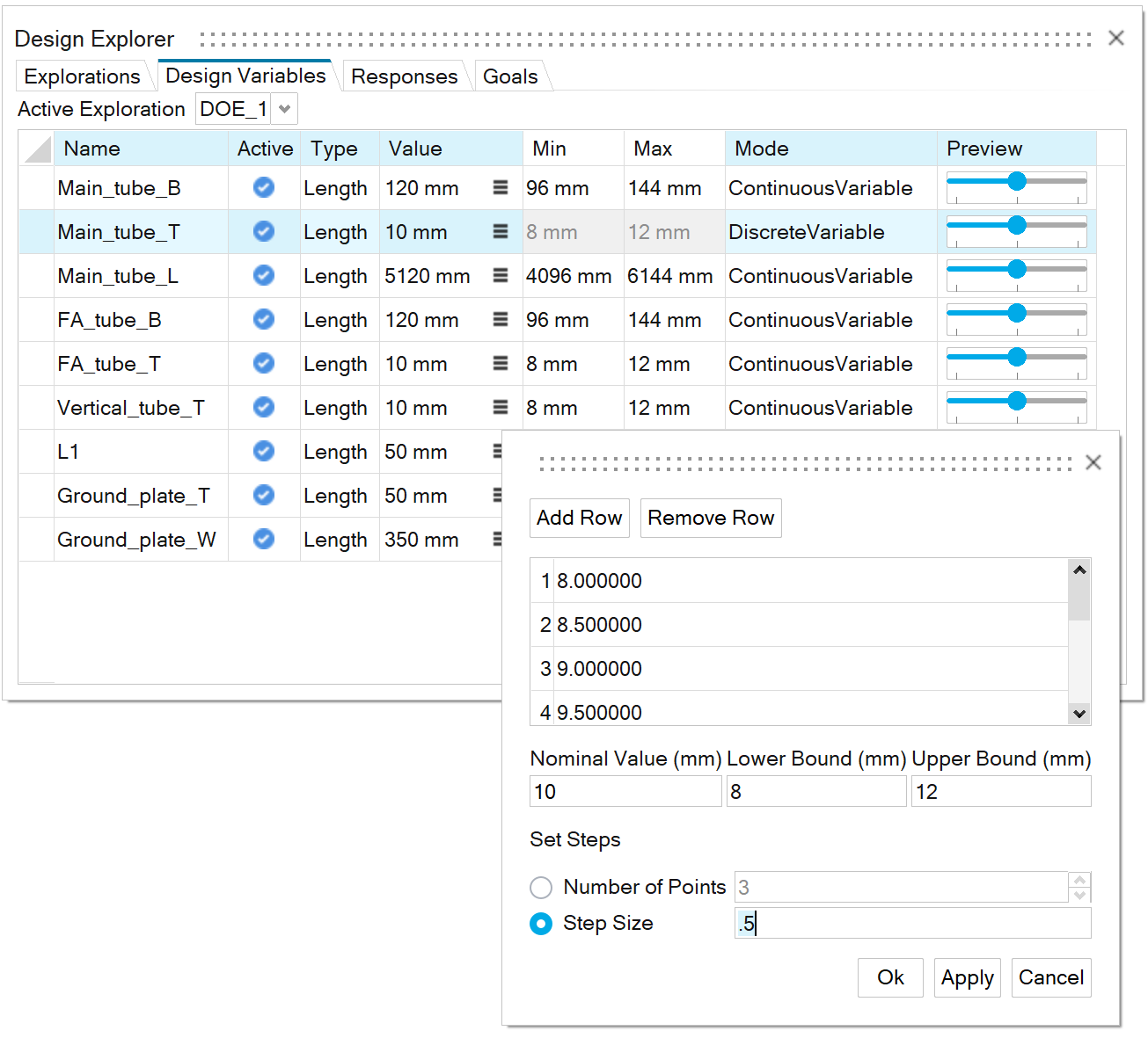 调整并查看设计变量 在“设计管理器”功能区,选择形状变量工具。 最小值和最大值将从初始变量值中自动生成。Main_tube_B=120 mm + 22.2% 生成 Min=96 mm 和 Max=144 mm。 对于 Main_tube_T ,将模式更改为离散变量。 在 Main_tube_T 行、值单元格中,选择 查看更多选项。 启用步长大小,并输入 .5。 现在您即将 Main_tube_T 的长度设置为在 8 至 12 mm 之间,以 0.5 mm 为增量。 点击确定。 要预览设计,请拖动预览滑块。您可以预览任何设计变量的最小值、最大值和公称值。 点击 Main_tube_L 的预览滑块左侧,查看该变量的最小值。注意图形区域的设计更改。 点击 Main_tube_L 的预览滑块右侧,查看该变量的最小值。注意图形区域的设计更改。 注: 当您退出“设计变量”工具时,所有变量将返回至公称值。