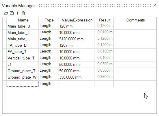 查看完全定义的几何变量 在“几何”功能区,选择变量工具。 显示“变量管理器”。这些变量是草绘时生成的。最佳实践是在创建几何变量时,确保所有零件在模型中完全约束。关于如何创建变量的详细信息,请查看视频教程:创建参数零件。 对于 Main_tube_L,请确保长度为 5120 mm。 关闭变量管理器。 按 F6 打开结构历史浏览器。。 双击 Sketch 1。该草图是黑色的,表明它为完全定义。 双击 Extrude 1。这是定义 Main_tube_L 变量的地方。要查看完整条目,在范围字段中点击并一直向左滚动,直至 Main_tube_L=4120.0000 mm。模型的这个部分为完全定义。 关闭“挤出”工具。 关闭结构历史浏览器。