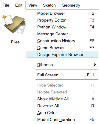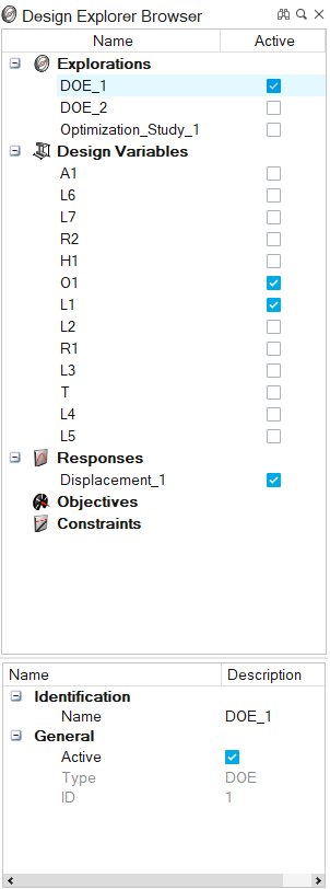打开设计管理器浏览器 设计管理器浏览器显示设计设置的分层视图,并可用于启用和禁用探索参数。 在视图菜单中,选择设计管理器浏览器。 这会打开设计管理器浏览器。此处显示所有已定义的参数。可以在任何给定的 Inspire 会话中创建多个探索。使用激活选项选择激活的探索,并在评估之前包括或排除所需的设计变量、响应、目标或约束。注: 一次只能启用一个探索。