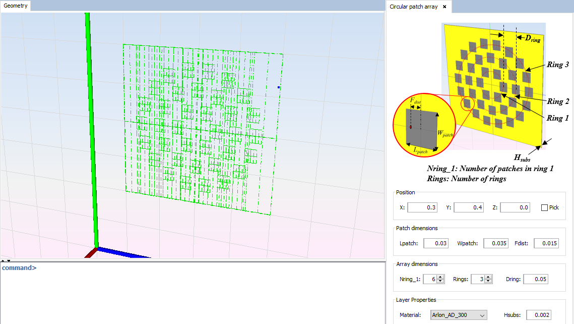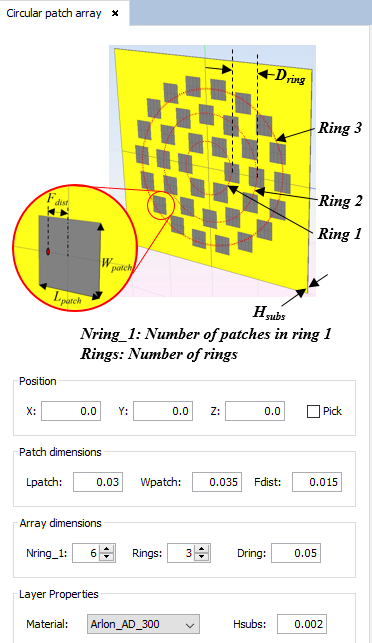 - Array dimensions set the values of the number of patches in the first ring (Nring_1), the number of rings (Rings) and the distance between rings (Dring).