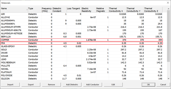 For conducting material, you should define the electric resistivity, relative magnetic permeability and thermal conductivity along to x, y, and z axis. For dielectric material, dielectric constant, loss tangent, and thermal conductivity along to x, y, and z axis would be needed.