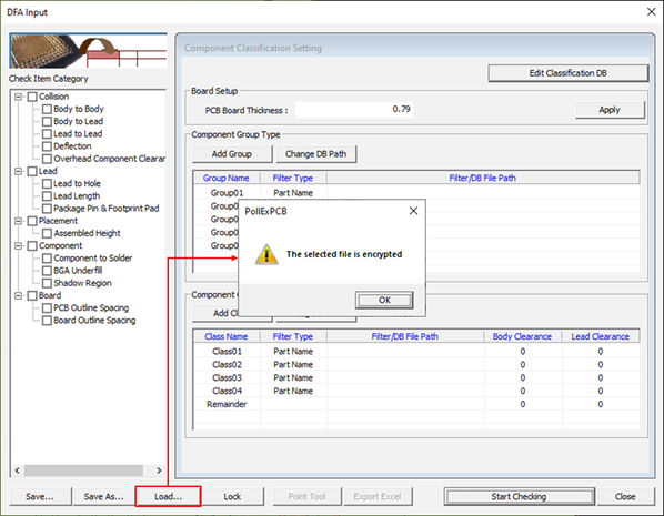 DFA input rule file (*.DFAI) can be locked to prevent any modifications from users. The purpose of the input file encryption is to keep a uniform set of rules throughout without tweaking them for certain application once the input setup is done by a designated person. Locked DFA input file can be used to verify a PCB design and only tweaked by the designated person.