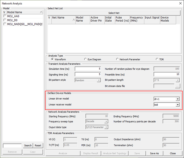 IO buffer device models of input and output pins of signal nets are stored in the part data file of individual components. When the device models are not available in the part data, the default linear device models defined here are used for transient simulation of signal integrity analyses. With the use of Linear Device Modeler, you can create linear output (driver) and input (receiver) device models and store them in a linear device model file. PollEx DFE+ provides you with a system default linear device model file, UDVS.dmf.