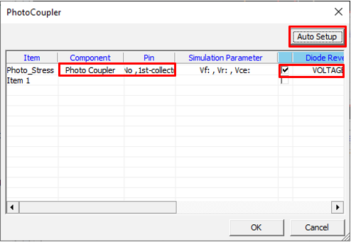 Set Photo Coupler component parameters for the Transient Stress Test item.