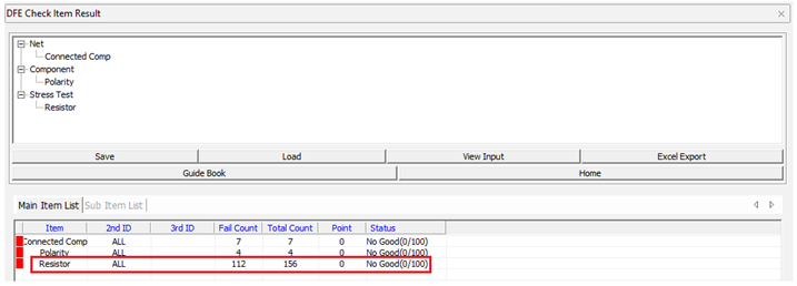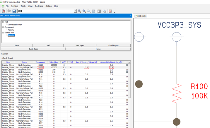 In the right window, you can see the error location and a picture. Review the list on the left and see the Working Voltage of R100 is 3.3V, but allowed Working Voltage is 0.5V, so it fails.