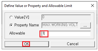 The Define Value or Property and Allowable Limit dialog opens. You can assign maximum allowable rated Working Voltage level by entering value or specifying the property name where the Working Voltage value is defined.