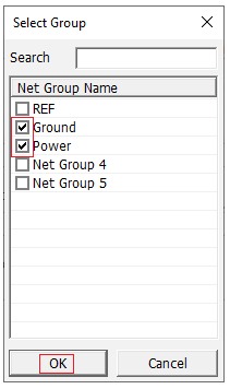 The Select Group dialog opens. You can assign component group that will be considered as short state during searching power rail.