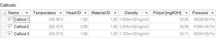 4. Optional: To display callouts in a table, click in the Analysis Explorer. Each callout is specific to a selected run.
