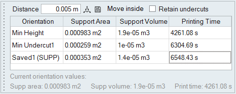 - Enter a Distance in the Orientation table to configure the distance between the part and printing bed. The minimum distance is 0.002 m.