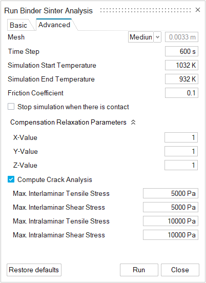 - Tell the solver to compute a cracking analysis. Use the fields to set the maximum allowable tensile and shear stress allowed within and between powder layers.