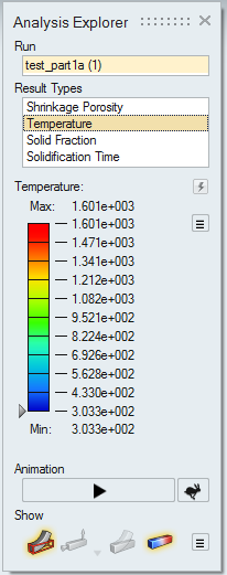 Use to view the results of a porosity analysis. You can view shrinkage percentage, temperature evolution, solid fraction, and solidification times for a selected run and load case.