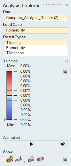 Use to view the results of a thinning analysis. You can view thinning percentage, formability, and thickness results for a selected run and load case.