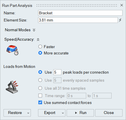 Use the Run Part Analysis tool to define and run a linear static, normal modes, or buckling modes analysis on a motion part.