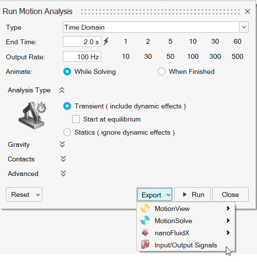 Export the motion model with analysis settings as a MotionView file (.mdl), MotionSolve py file (.py), or nanoFluidX position file (.txt).