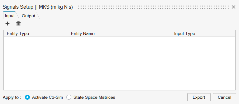 Define and export Input/Output signals for solving a State Space Eigen analysis in Inspire, or set up a Co-Simulation with Activate (.py file).
