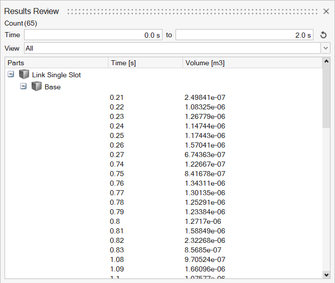 To Do this View detected interferences in the model at a specific time In the Results Review window, click on a Time [s] entry in the list of detected interferences. The corresponding instance of the interference result will highlight red in the model. View the number of detected interferences In the Results Review window, refer to the Count section. The number in parenthesis shows the number of detected interferences. Filter detected interferences by time range In the Results Review window, enter start and end times in the Time section. View all detected interferences In the Results Review window, select the View dropdown menu, then select All. View only the first detected interference In the Results Review window, select the View dropdown menu, then select First Interference. View parts included in the detected interferences In the Results Review window, review the list of Parts. Restore default values in the results window specifications In the Results Review window, select .