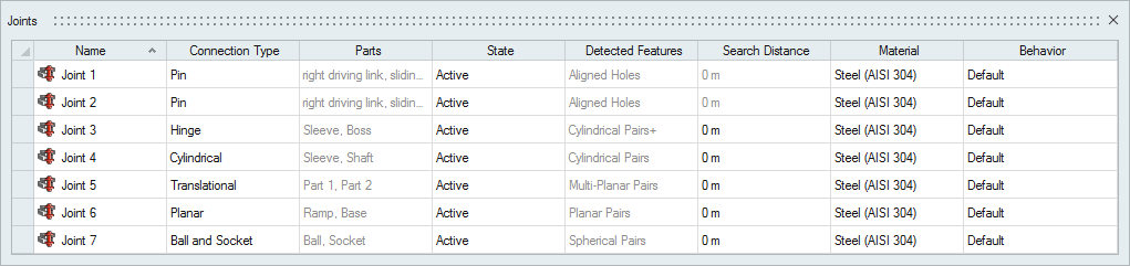- Joints are available in a variety of types such as Pin, Hinge, or Ball and Socket. The types available vary based on the feature where the joint is being applied.