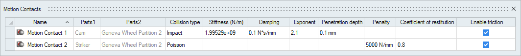 The Motion Contacts table lists all of the motion contacts in your model including the parts in each contact set and various other parameters.