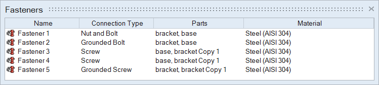 The Fasteners table lists all of the fasteners in your model including the type of connection, the parts it connects, and the assigned material.