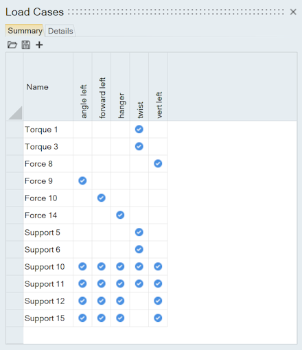 - Select a table cell on the Summary tab to toggle a load on or off for a specific load case. Loads are shown in rows; load cases in columns.