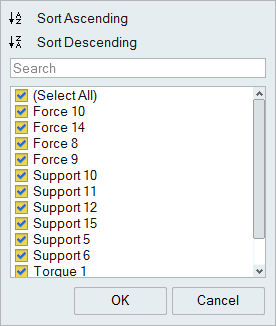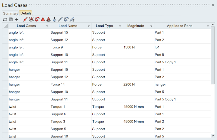 Use the filter icons on the Details tab in the Load Cases table to show only loads of a specific type.