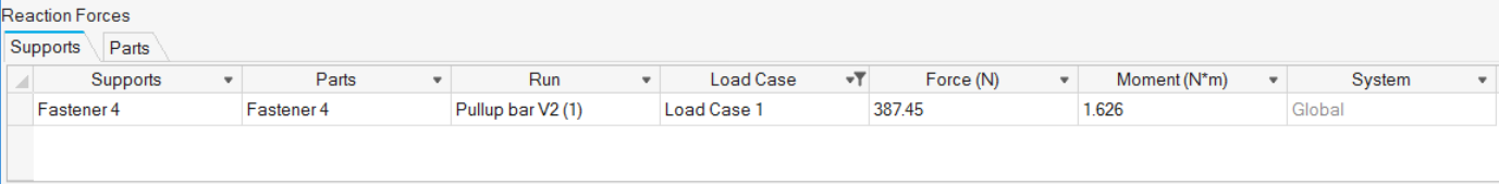 - Use the Parts tab to view a summary of the reaction forces for a selected part. This will display a summary of all connection and support forces excluding applied loads, but including body loads such as gravity.
