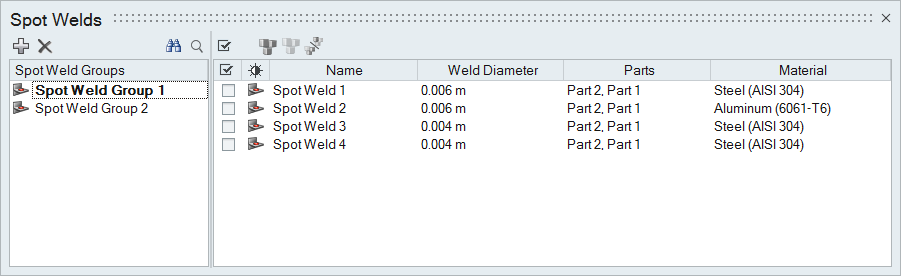 The Spot Welds table lists all of the spot welds in your model. It can be used to change the weld diameter and assigned material or to import/export designated spot weld points in .csv format.