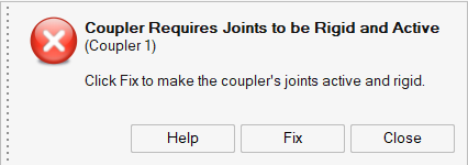 A warning message is displayed, noting that couplers require joints to be rigid and active.
