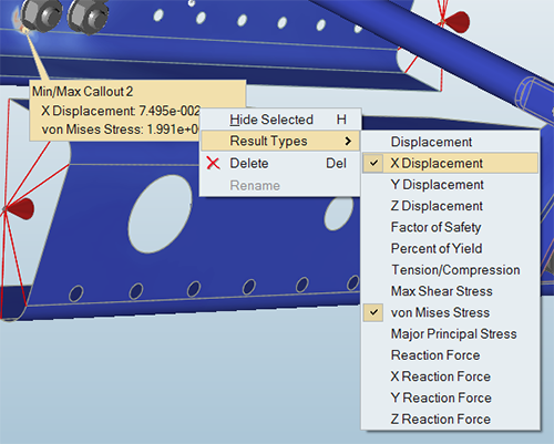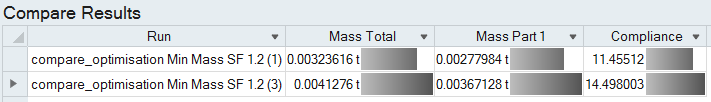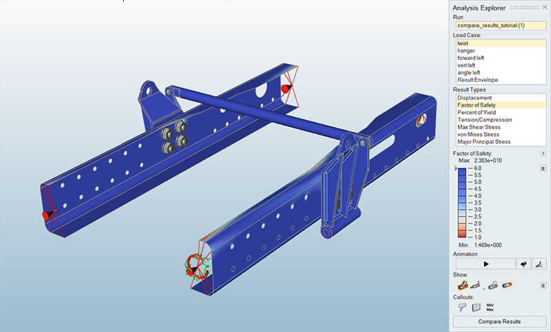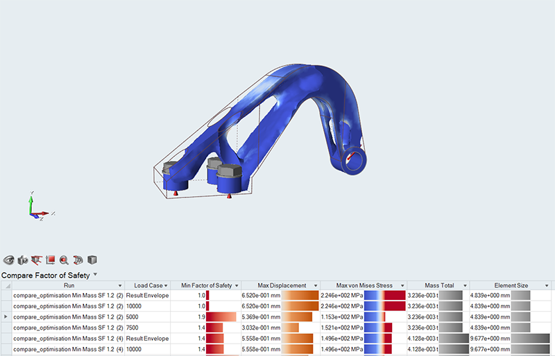 When performing optimization or finite element analysis, it is typical to generate many different models and results, each with slight variations. The Compare Results feature allows you to easily display and compare analysis or optimization runs in a table format. All of the results that have been generated or loaded into Inspire during the current session can be compared. When combined with callouts, this allows for detailed interrogation of analysis results.