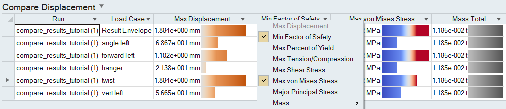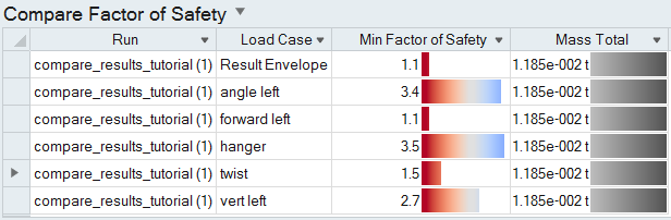 - Performing an analysis with multiple load cases. For example, the maximum stress results across all load cases can be compared in a single table.